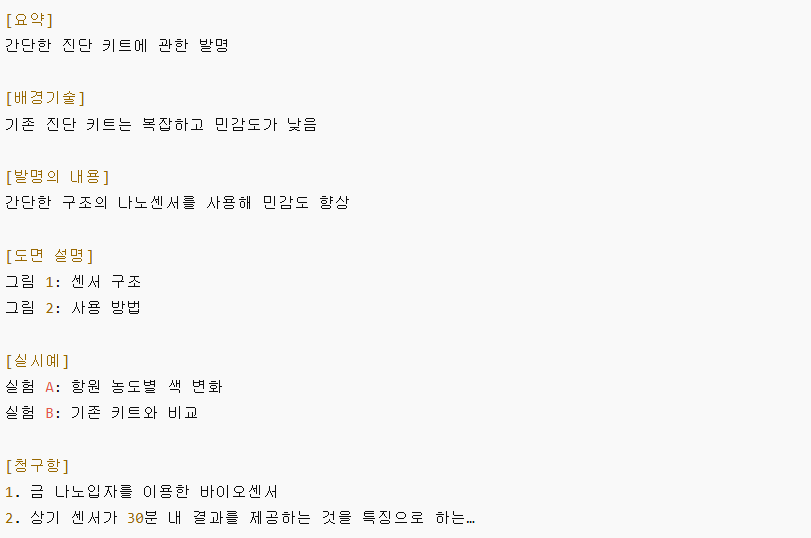 예: “본 발명은 신속한 진단을 위한 나노바이오센서에 관한 것으로, 특정 항원에 반응하는 금 나노입자를 기반으로 한다.”